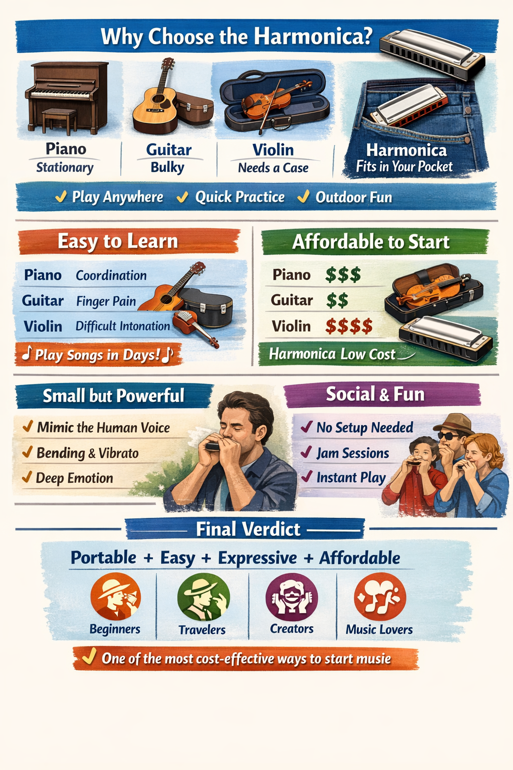 When choosing a musical instrument, most beginners consider piano, guitar, or violin. However, the harmonica has been rapidly gaining popularity in recent years. So what makes the harmonica different—and why are more people choosing it? Let’s break it down. 1. Portability: The Ultimate Travel Instrument Compared to most instruments: Piano: stationary Guitar: bulky Violin: requires a case Harmonica: fits in your pocket 👉 This means you can: Play anywhere, anytime Practice during short breaks Perform outdoors effortlessly 📌 Conclusion: Harmonica is built for modern lifestyles 2. Learning Curve: One of the Easiest Instruments Many people quit music because it feels too difficult. Comparison: Piano: requires coordination Guitar: finger pain + chords Violin: extremely hard intonation Harmonica: beginner-friendly Why? Sound comes instantly Simple to start melodies Fast sense of achievement 📌 You can play your first song within days 3. Cost: Extremely Aff