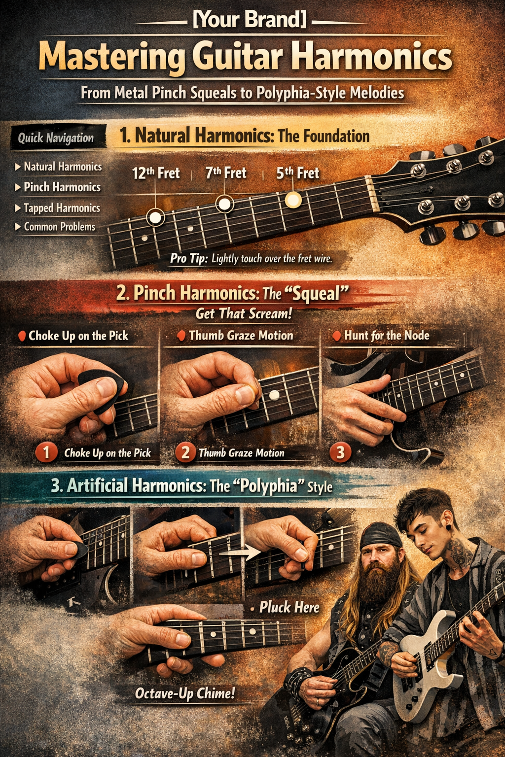 How to Play Guitar Harmonics: Pinch, Natural & The "Tim Henson" Style | [Your Brand]Mastering Guitar Harmonics: From Metal Pinch Squeals to Polyphia-Style Melodies Whether you want to scream like Zakk Wylde or create crystal-clear chimes like Tim Henson, mastering harmonics is the key to unlocking your guitar's full potential. Quick Navigation Natural Harmonics (The Basics) Pinch Harmonics (Metal Style) Artificial & Tapped Harmonics (Modern Style) Common Problems 1. Natural Harmonics: The Foundation Natural harmonics occur on open strings at specific nodes. The most resonant nodes are found at the 12th, 7th, and 5th frets. Pro Tip: Place your finger directly over the fret wire, not in the middle of the fret. Lightly touch the string—do not press down! 2. Pinch Harmonics: The "Squeal" Often associated with high-gain metal, pinch harmonics act by cancelling the fundamental frequ