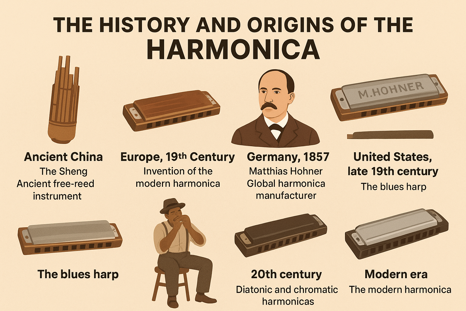 How a 3000-Year Cultural Journey Created the Modern Harp) The harmonica—often affectionately called the harp in blues and American folk culture—is one of the world’s most portable, expressive, and emotionally rich instruments. Its voice can sound warm and lyrical in classical pieces, gritty and soulful in blues, or bright and vibrant in folk and country music. Yet few people know that this small instrument carries a history stretching back over three millennia, beginning far away in ancient Asia. 1. Ancient Roots: From the Chinese “Sheng” to the First Free-Reed Instruments The true origin of the harmonica does not begin in Europe—it begins in ancient China. The earliest ancestor of today’s harmonica is the Sheng, a traditional Chinese instrument based on free-reed technology. As early as 3000 years ago during the Shang and Zhou dynasties, the Sheng already used metal reeds that vibrated freely with both blowing and drawing—exactly the same acoustic principle used in modern harmonica
